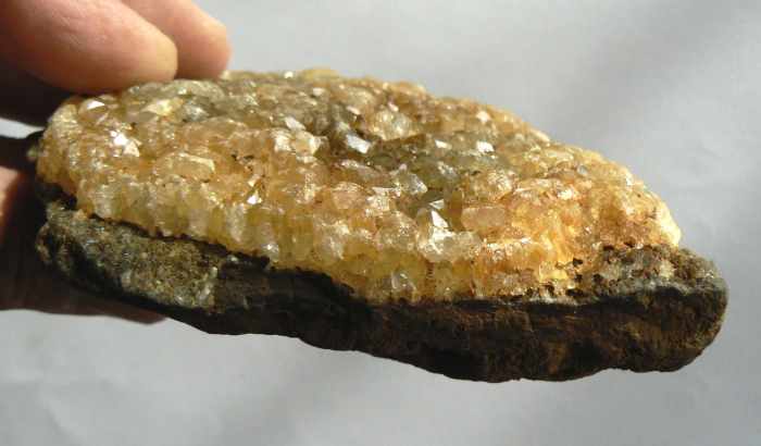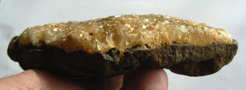 J'ai ramassé cette pierre pour sa forme losangique pas courante qui a attiré mon regard et quand je l'ai retourné est apparu ce nappage de quartz, je la trouve déjà très sympa comme ça, mais la gamberge a pris le dessus, elle mesure 8 cms par 12, elle tient très confortablement dans la main et lorsqu'elle est sur une surface plane côté diamants elle ne pose que sur le milieu de la pierre étant légèrement incurvée, bon la question est : aurait-elle pu servir de molette pas pour moudre des graines car avec les pointes de quartz cela ne devait pas être aisé mais plus pour broyer des tubercules ou des racines, c'est mon côté Rahan qui a pris le dessus Merci pour vos avis.