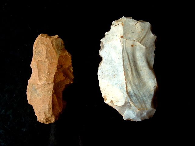 Le silex à patine blanche pourrait bien être un denticulé quoique le gars à pas fini sont boulot et a laisser un bout de tranchant genre couteau, le deuxième me parait être en quartzite et est certainement composite, coche et racloir. C'est bien ,thierry de mettre le recto-verso ainsi que les tranchants de face, la par exemple on sait pas si l'autre côté est un dos aménagé ou un tranchant.Biface
