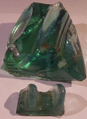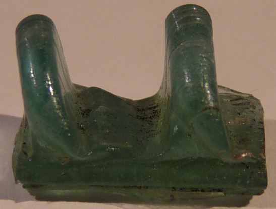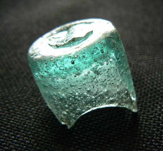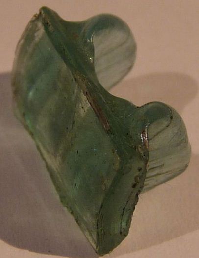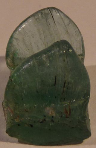 voici un morceau de verre bleu vert que je pense assez ancien, pouvez vous me confirmer son époque et ce qu'il vous évoque de par sa forme.