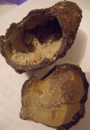 Cette pierre parait ferreuse mais n'est pas magnétique et elle est creuse les parois font environ 5 mm épaisseur et elle est très fragile, a l'intérieur la paroi est jaune claire et il y a une espèce terre argileuse qui forme une sorte de boule, et lorsque l’on secoue cette pierre elle grelotte !! Dans la région où je l'ai trouvé (Isère) les anciens l'appel pierre grelot pour certain cella proviendrais d'une météorite?? Je joins des photos mais malheureusement je n'ai pas de morceaux de cassé a montré et je ne veux pas casser celle la!!