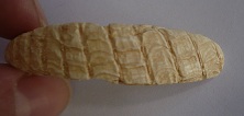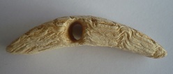 j'ai aussi trouvé cet objet, qui mesure environ 6 cm de long. On dirait de l'ivoire (peut etre une dent taillée?), et c'est percé au centre..