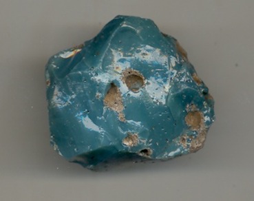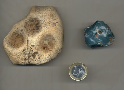 Et à gauche de la photographie, une pierre bleue, ça ressemble plutôt à du verre, trouvée là encore sur mes terres où il y a eu présence gallo-romaine et médiévale.