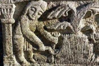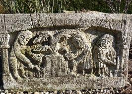 Comme Iron ça fleur le moyen-âge,calcaire, granit pas facile à voir sur la photo, si tu prends d'autres photos prends des gros plans des visages.J'ai agrandit au mieux la photo, j'y vois trois forgerons s'activant autour d'une forge, ce qu'on pourrait prendre pour une sorte d'oiseau sont les flammes de la forge.
