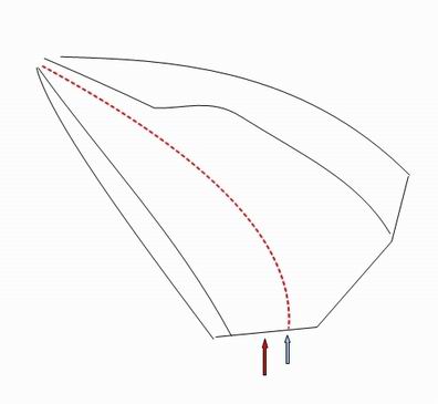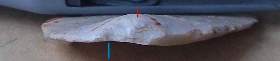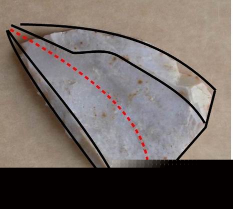On pourrait penser à un Levallois où la préparation par le deuxième enlèvement (en bas à gauche) s'est mal passée créant une arrête courbe (rouge pointillé) qui a guidé le troisième enlèvement vers la gauche.