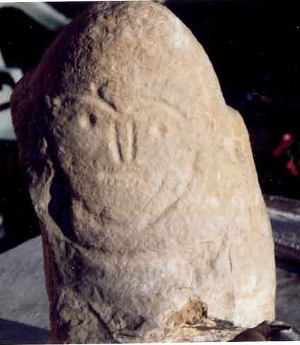 Pour la sculpture il y a vraiment un air de stèle néolithique, les sourcils sont dessinés par le haut du cœur, mais comme tu dis la bouche avec les dents est bizarre. Au premier abord il semblerait que la forme d'ogive est naturelle et que le sculpteur a choisi se bloc pour sa forme initiale mais je peux me tromper. On le voit mal sur les photos mais il y a également une gorge sculptée sous le visage qui pourrait représenter des bras.