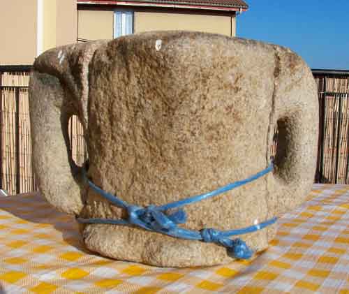 Dans le post 103514, Philippe m'avait identifier un récipient à mélasse de forme conique avec un trou pour l'écoulement dans la jarre.L' objet présenté aurait pu servir de support à une sorte de jarre ou d'amphore sans pied ? Une idée comme ça.