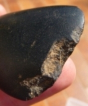 [229] En effet ce pourrait être une éclogite, une mesure de densité pourrait éventuellement aider à confirmer. J'ai eu en main des haches dans ce matériau et leur aspect était identique : couleur générale noire mais avec une fine texture comprenant du vert (jade).