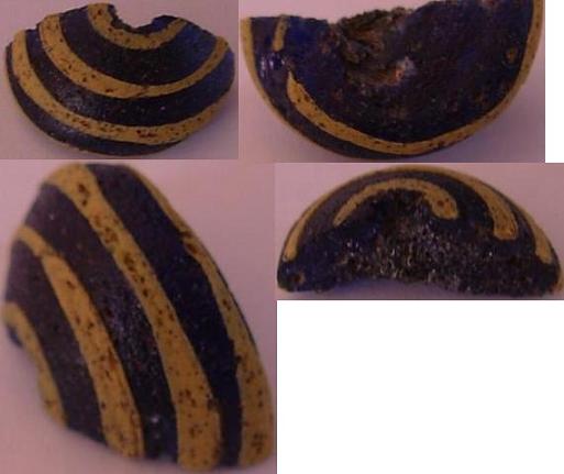 [New10] Bonjour à tous, voici un objet en pâte de verre bleu foncé, entouré de rayures jaunes. Objet trouvé à l’œil nu dans un champ sur la commune de l'escala en catalogne (Espagne), ancienne ville gréco-romaine Ampurias.