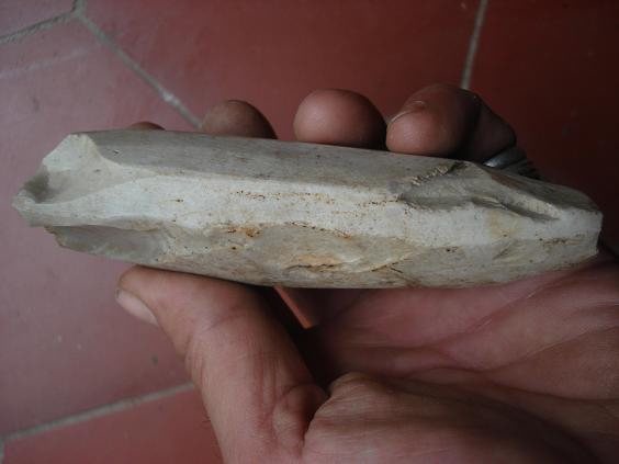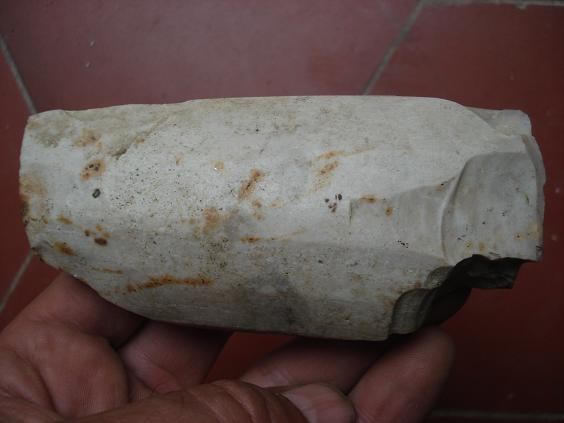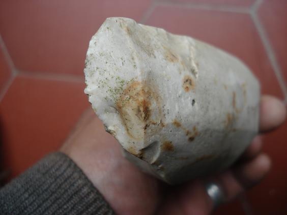 Hier j'ai rendu visite à une amie dans le centre Vexin qui venait d'exhumer de son jardin qu'elle venait de retourner, cet objet manifestement taillé avec une belle patine crème typique de ce que je trouve par içi..