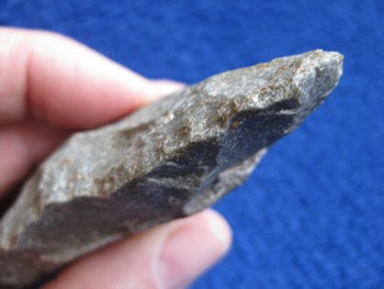 biface 22/50 très polie macro, évidemment un tel matériau doit permettre d' obtenir des bifaces, j'ai eu l'occasion de voir un expérimentateur sortir une feuille de laurier dans un grès lustré (de Fontainebleau je crois) mais dans le cas de l'outil de galopin je ne suis pas sur que ce soit la même matière.