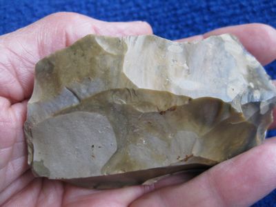 Comme pour mon précédent post, cet outil trouvé également en labours du 78 mais dans un silex totalement différent, présente aussi beaucoup de traces de débitage. J'ai toutefois la conviction d'être en présence d'un outil car le tranchant est bien existant et des traces d'usure apparaissent dessus. S'agit-il d'un racloir, ou mieux, d'un 'chopper' ??