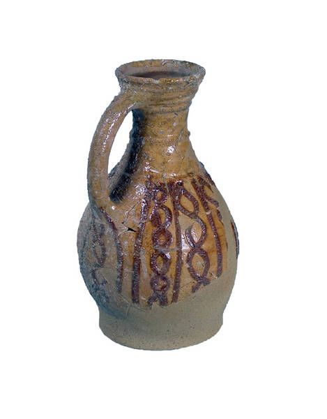 Il faut aussi savoir qu'avant le 13ème siècle, la glaçure sur la poterie ne se pratiquait pas. Ce qui fait que la poterie ancienne ce situe entre le 14ème et le 19ème siècle. C'est encore toujours un laps de temps de 500 ans ! Là , il n'ya qu'un moyen de s'en sortir, c'est de voir la typologie des ateliers de poteries locaux, qui eux donnent une idée de types de récipients utilisés pendant certaines périodes. Il faut donc connaître la forme des socles des cruches, la forme des anses, des cols de cruches avec ou sans bec verseur et la forme générale de la panse de la cruche. En forme de boule, de poire, allongé voir étiré, décoré ou pas. La décoration est aussi importante. Elle peut être peinte, gravée ou sous forme d'appliques ( médaillons etc..). Fait certain est que pour la poterie, en général, la couleur bleu cobalt n'a été utilisé qu'à partir de la fin du 16ème siècle. L'usage de la manganèse date du début du 17ème siècle.