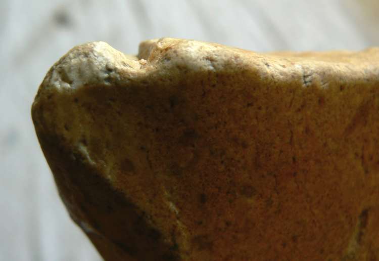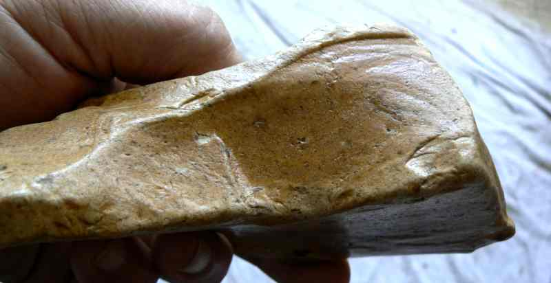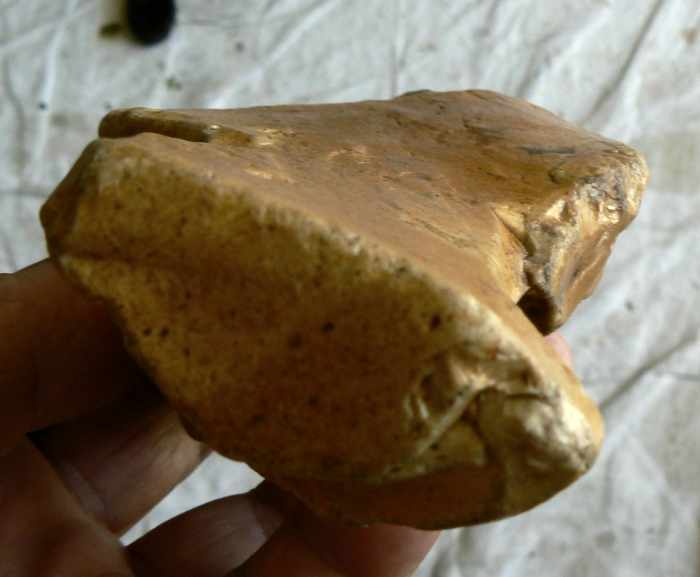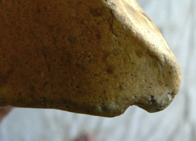 ...Le point d'impact se trouve à droite du talon du 'manche'. La bestiole c'est taper l'incruste dans la photo, j'ai remis une photo pour mieux voir le côté concave de cet éclat.