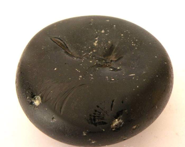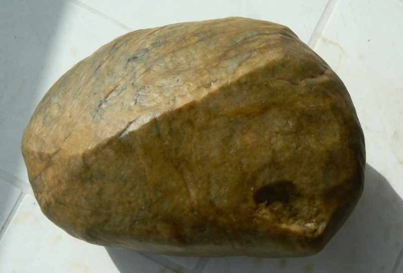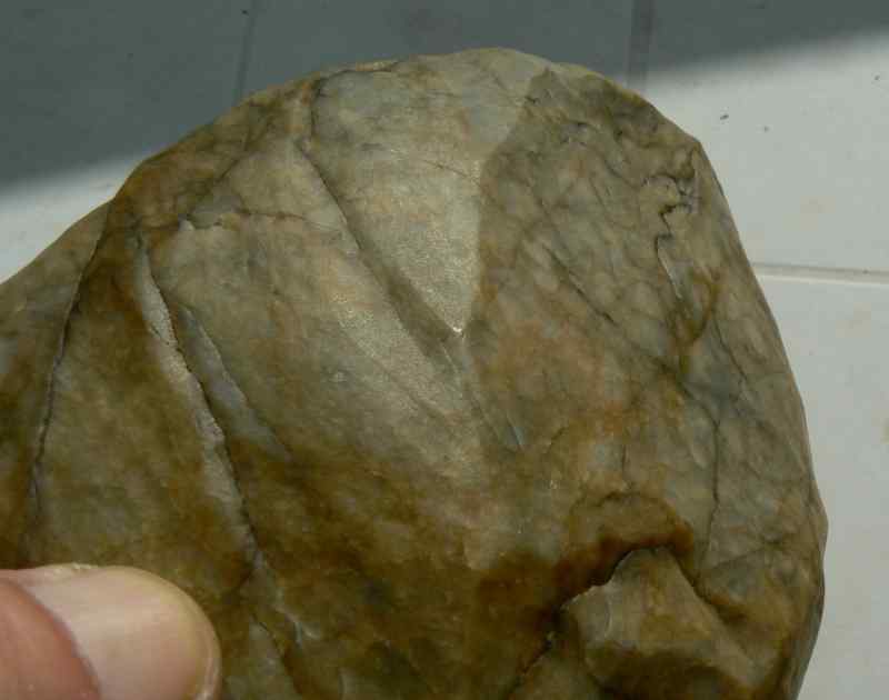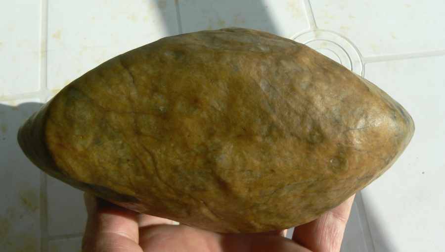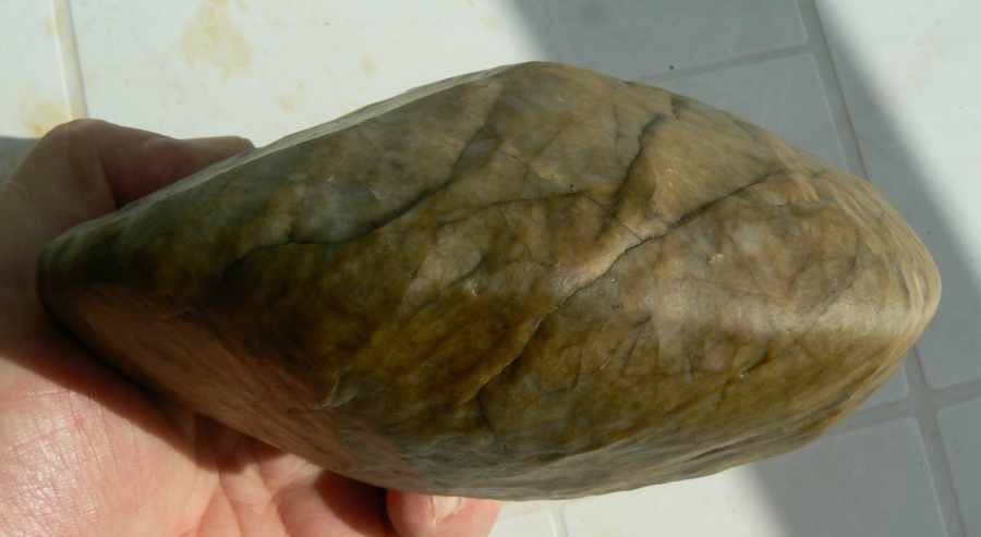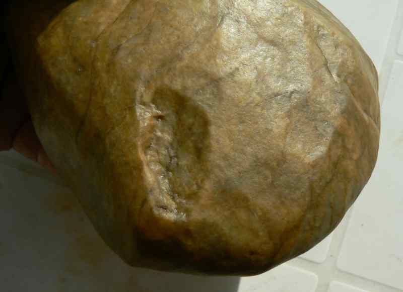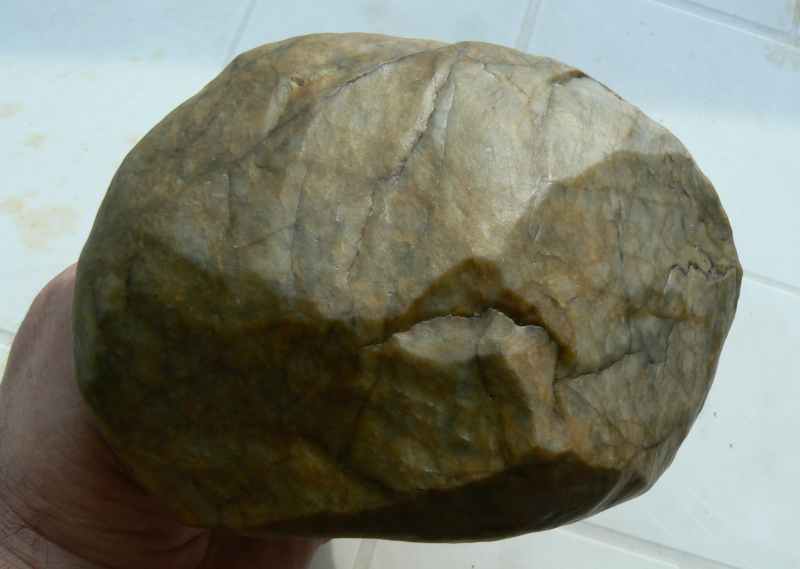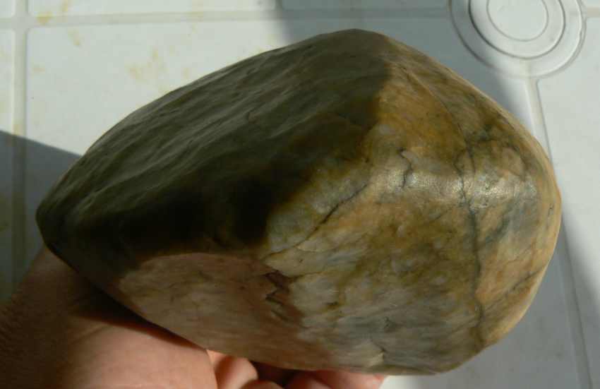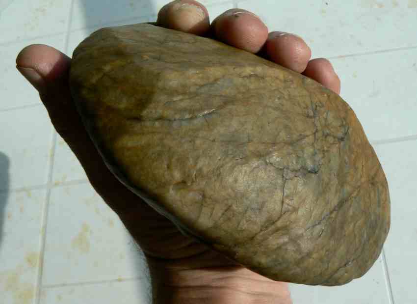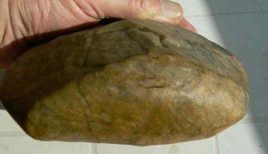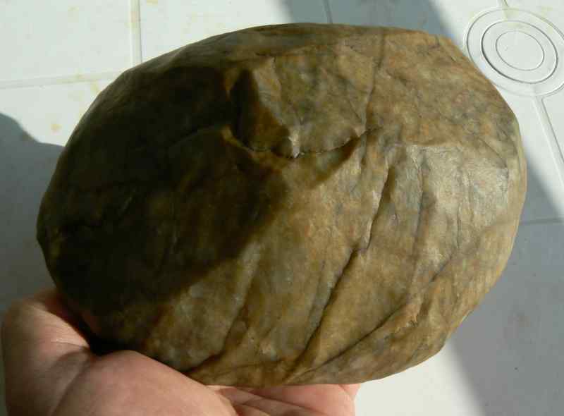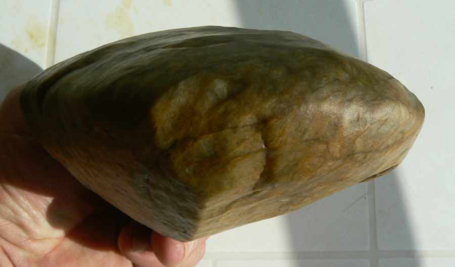 Je vous présente cette trouvaille alluvionnaire. Quand je l'ai vu, j'ai pensé à un galet ordinaire mais quand je l' ai nettoyé de la vase, est apparu ce que vous voyez. Il ne ressemble pas autres galets trouvés aux alentours . Il est doux au touché comme si il avait été poli, ne possède aucun bec d'ongle même sur des galets trouvés à la côte et plus poli qu' une hache du néo il reste toujours des traces de bec d'ongle mais là pas un seul. La chose me semble taillée, polie et de forme bien équilibrée. J'ai d'abord pensé à une molette, mais en me souvenant du post de Yves 82934 , je me suis dit que cela pouvait être un lissoir à papier.