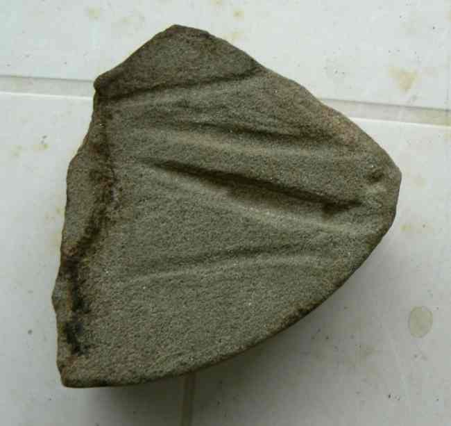 J'aurais voulu savoir ce que représente ces traces sur ce fragment de meule à aiguisé circulaire, drôle de façon d'aiguiser son canif ?, des pointes de flèches ? peut-être ?