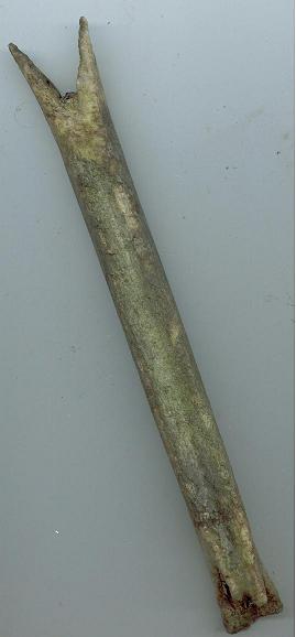 Est-ce qu'il y a une rivière pas loin, ou un étang ? C'est possible que cet os est été taillé de la sorte pour faire office de maintien pour un canne à pêche !