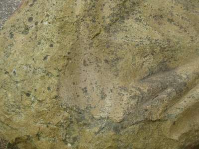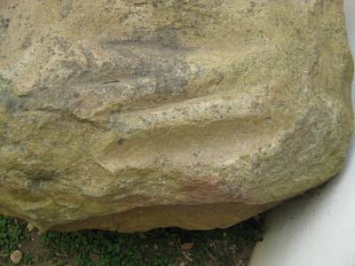 Bel exemple de polissoir sur bloc rocheux, on reconnait sans équivoque les rainures en V et en U largement évasé associées aux plages de polissage.