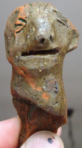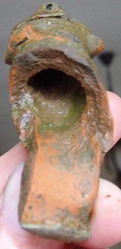 Cela ma tout l'air d'être un bouche d'une fontaine. La céramique a été cuite à une température relativement basse ( donc ce n'est pas du grès). En plus elle a été recouverte d'une glaçure au plomb. Seul le style peut nous donner une idée de l'époque, mais là encore, la tête a été formée par un amateur et non pas par un sculpteur-potier professionnel. Je suppose, le doigt mouillé et pointé dans la direction du vent, qu'il s'agit d'un pièce moyenâgeuse, mais je n'oserai pas coller de date ou de siècle sur cette pièce. Mon inuïtion me dis et ce n'est là qu'une supposition, qu'il devrait s'agir du 15ème siècle.... sous réserve !!!