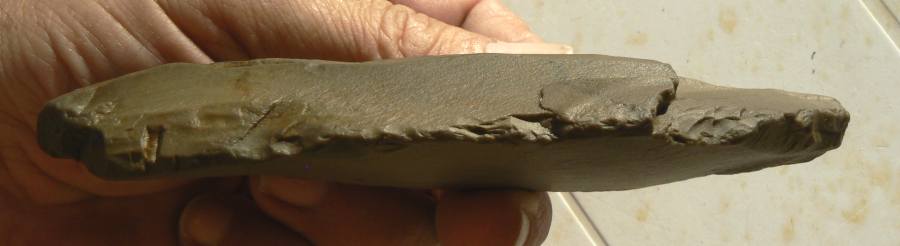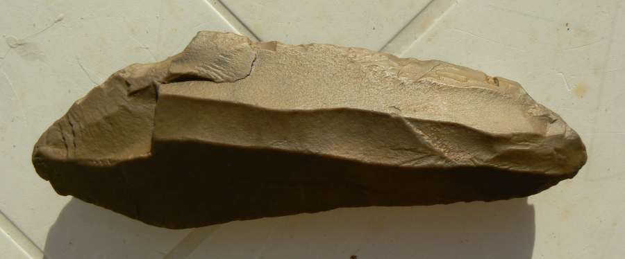 Je vous présente cette lame épaisse en quartzite de 15 cms de long. J'y verrais bien un pic-ciseau, peut-être même un double pic-ciseau ? Merci pour vos avis.