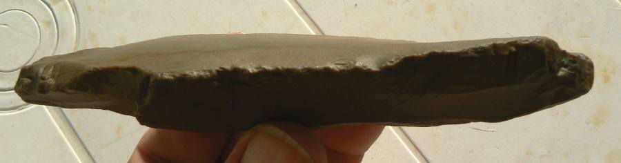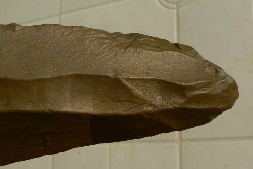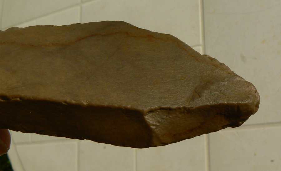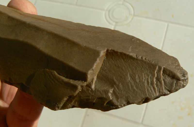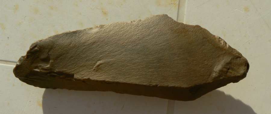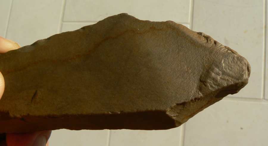 Bien d'accord avec toi Biface que la chose est anthropique, le talon est à droite en R2, on voit le bulbe, pas facile à rendre en photo mais un tiers de lumière à droite et les deux autres tiers dans l'ombre.