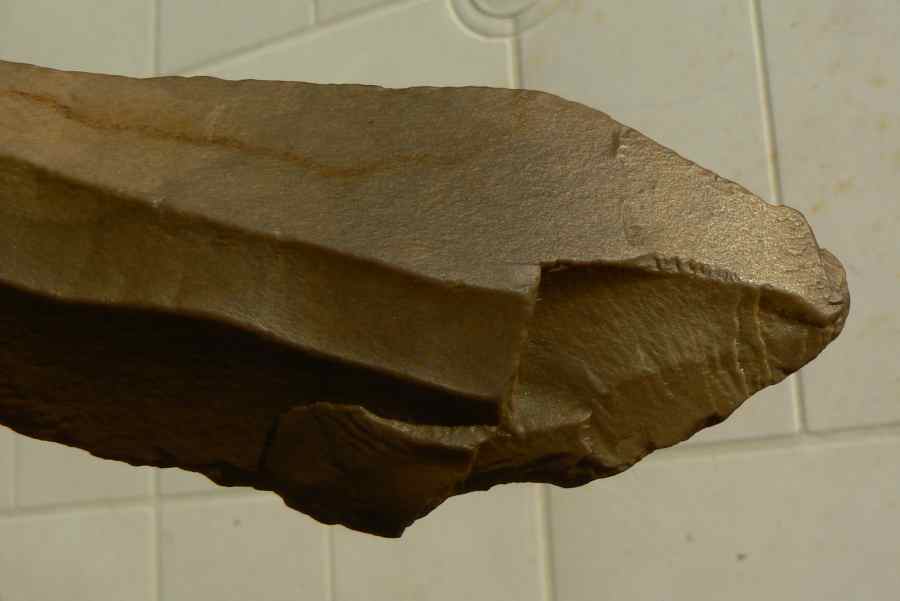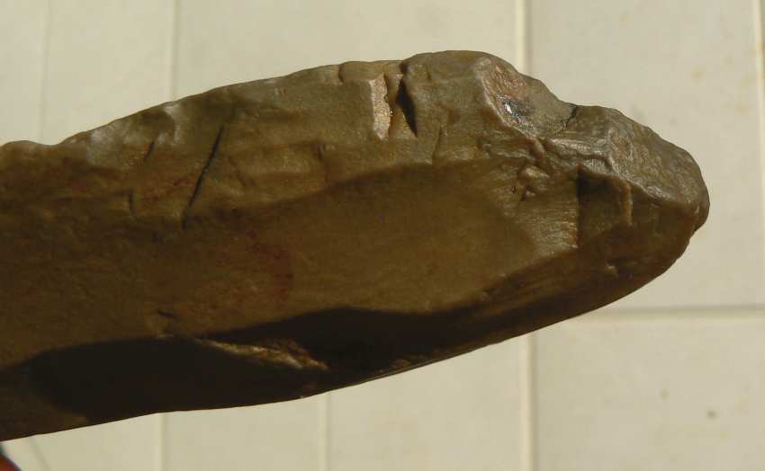 De ce que j'ai pu en voir sur le net, il y a cet enlèvement semi-circulaire qui est caractéristique du pic-ciseau non ? Il y a aussi un du coup de burin ?