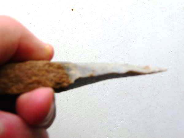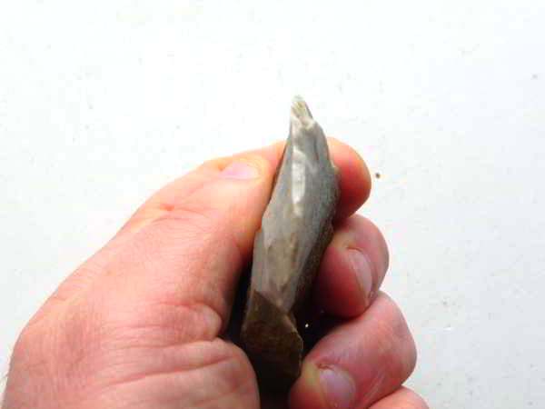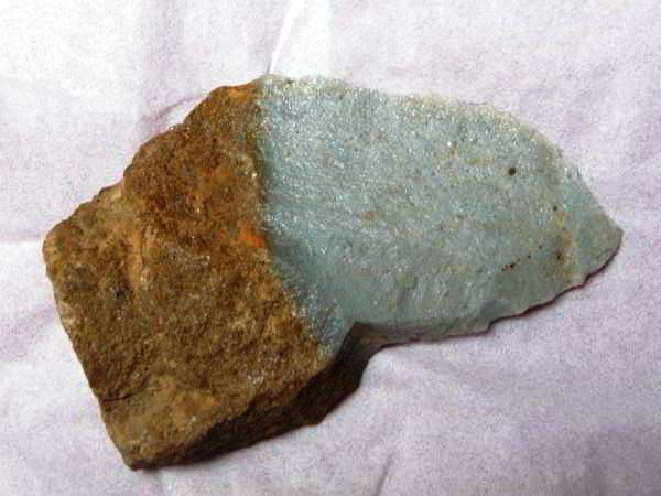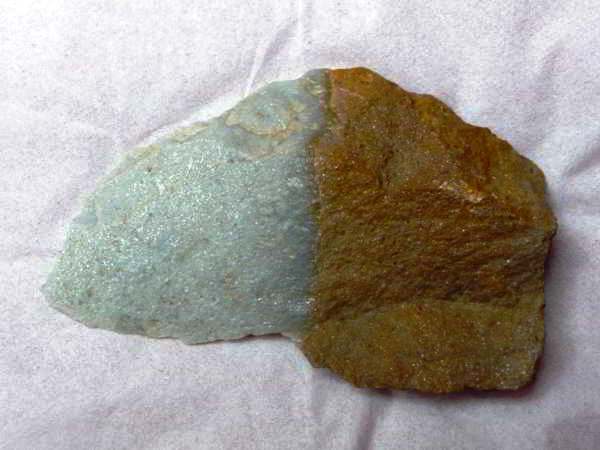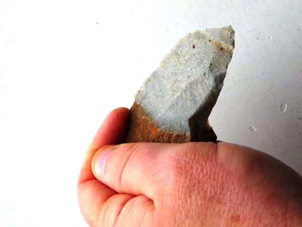 La roche brune constituant la partie préhensible, la partie bleutée (grès lustré) le côté tranchant.