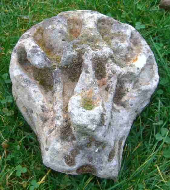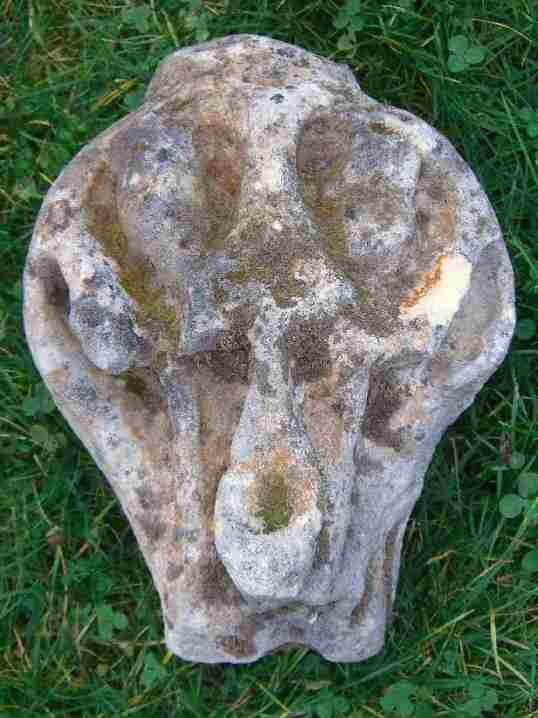 C'est bien un élément de décoration architecturale , le trou et le plat qui l'entoure l'atteste. Par contre pas de trace de rouille ni de vert pour une tige de fixation soit en fer ou bien en bronze ? Pour sa signification ? Une coquille St-jacques ? Une patte de lion, motif floral ?