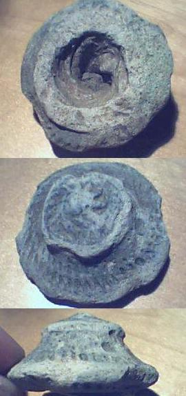 Le trou dans l'objet (photo du haut) semble avoir été fait par une rotation (d'un doigt, d'un bout de bois...), dans un mouvement vers la gauche, au vu de l'intérieur du trou.