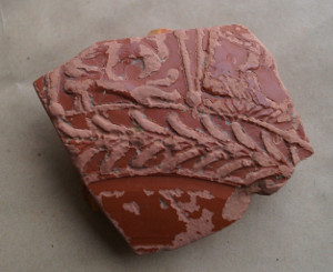voici un fragment de poterie gallo rom.? avec un joli décor(scène de chasse?)