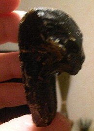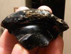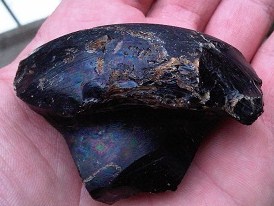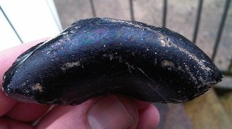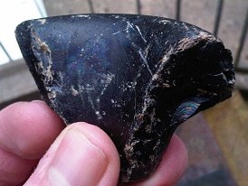 Voici un morceau de vase en verre de couleur noir avec des reflets pétroles trouvé sur un lit du tarn en Aveyron parmi les galets.