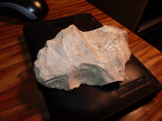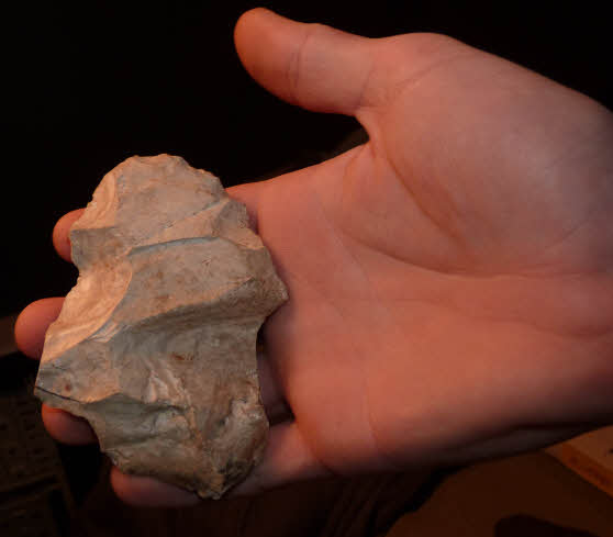 Bonjour, voici un silex, enfin je crois ! Trouvé dans un champ en faisant un trou, en détection. J'ai mis une photo avec ma main pour les dimensions, si vous souhaitez que je sorte la règle je peux. Voilà, si vous avez une idée !