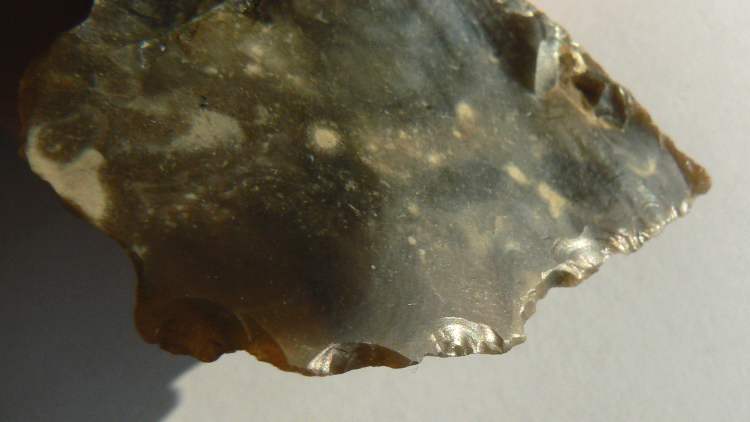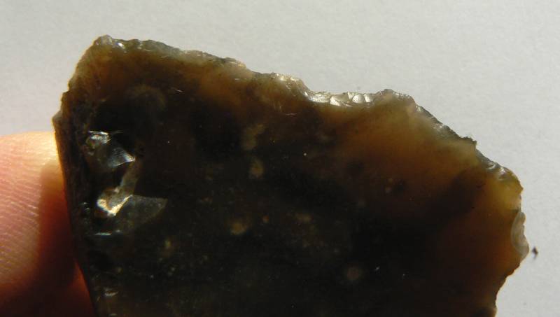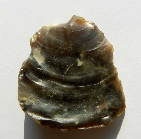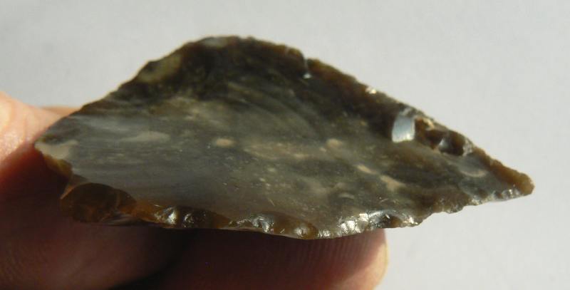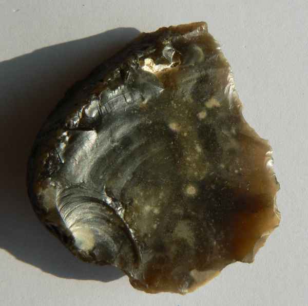 Je vous présente le racloir dont je vous parlais dans le post précédent. C'est un beau silex brun avec des inclusion blanchâtres. Eclat sorti d'un galet, on se demande si il a eu le temps de servir. Merci pour vos avis.