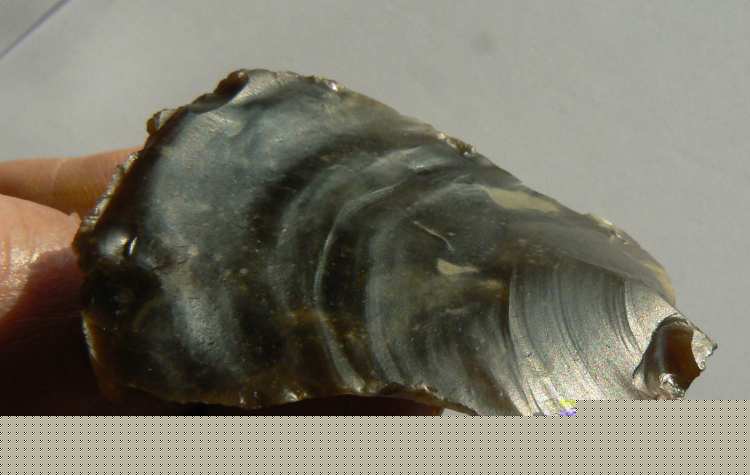 Merci pour vos avis. Le bulbe est à droite en R2 et a été aplani par un enlèvement, en R3, sur l'autre face, on y voit un contre bulbe en négatif. J'ai déjà présenté ,Gigi, des silex ou quartzite à forte ondulation qui on été identifier comme outil. Je ne pense pas que de fortes ondulations ont un rapport avec la force du coup, peut-être qu'Iron en tant que tailleur pourrait nous en dire plus. C'est surtout la régularité des enlèvements sur le tranchant en R3 et R6 ainsi que les petites esquilles du recto en R5 qui m'ont incité à vous le présenté, sinon celui-ci restait un simple éclat, qui malgré tout pouvait couper et racler. Je précise qu'il n'a pas été piétiné ou chose dans le genre.