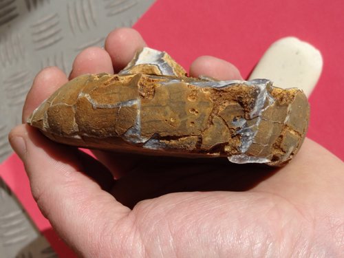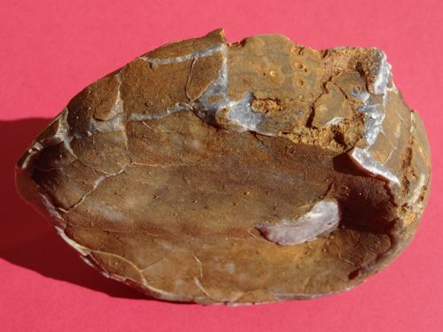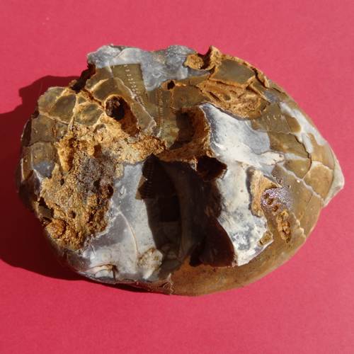 Moule interne d'un Echinocorys écrasé. En R6 la tache blanche vers le bas de l'oursin est la bouche. La tache blanche en haut est l'anus. Les lignes de points (il y en a 5) sont les aires ambulacraires. Il est intéressant ton oursin. Fossilisation et écrasement. Dissolution du test et silicification du moule interne. Il en a vécu de 'bonnes'!! ... :)