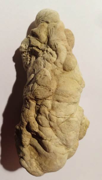 Je suis intrigué par cette pierre d'aspect globuleux (6cm de long, 3cm de large, 60.5g), ramassée cet après-midi à la surface d'un champ de Haute Garonne. J'ai d'abord pensé à un résidu de fonte de plomb, mais cet objet n'est pas métallique. Cela ne ressemble pas non plus à du calcaire type stalagmite...