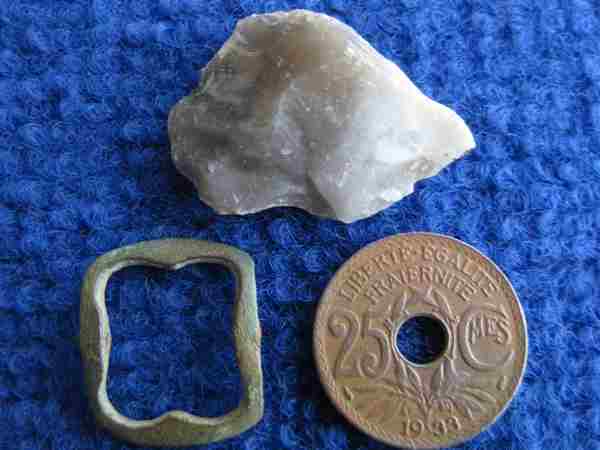Je présente ces modestes trouvailles en No Métal pour montrer la taille de ce petit 'outil' par rapport à la monnaie. Trouvé à vue bien sûr, dans un labour des Yvelines.