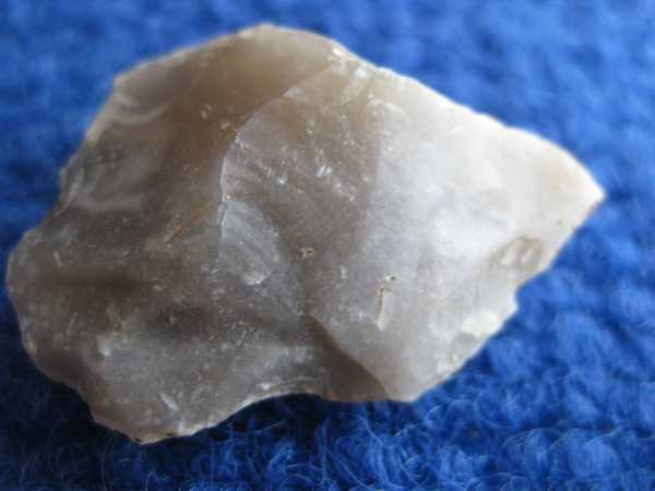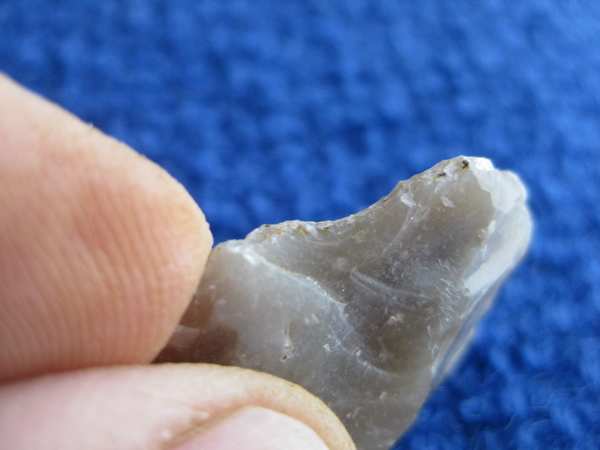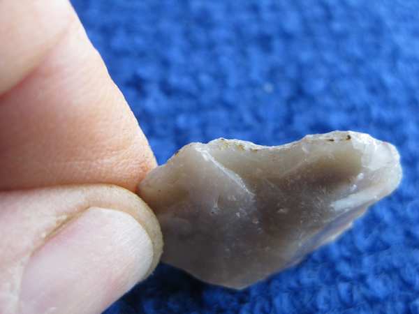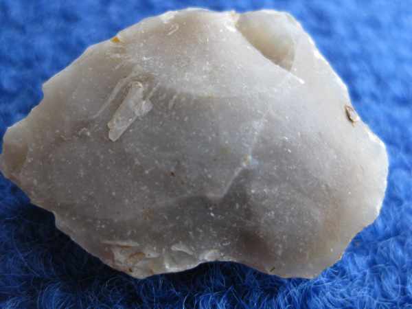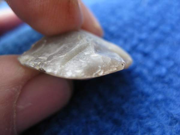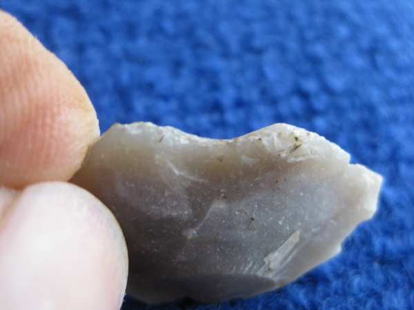 J'y trouve ce qui me semble être des traces de débitage, un plan de frappe et un bulbe de percussion et cette coche qui présente des traces de retouches.