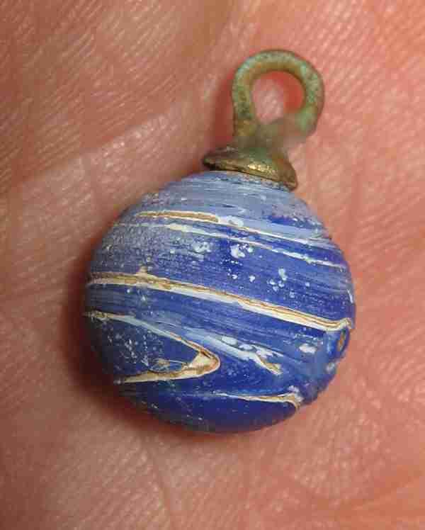 Pëndentif ,trouvé sur un champ seul sans contexte ...il est en pâte de verre et suspension en cuivre ou bronze ? Ce n'est pas trop mon domaine ,donc si vous avez une idée sur son passé ,etc...soyez en remercié d'avance ...