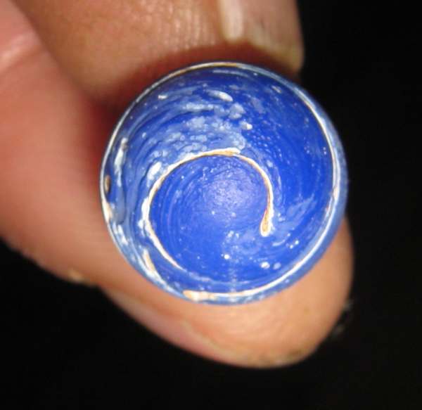 Concernant le verre je ne sais pas dater cela, je peux juste dire qu'il n'a pas été coulé mais probablement c'est une baguette de verre teinté au cobalt (ou au cuivre si ancien) ramollie puis pressé dans un moule pour obtenir une sphère parfaite.
