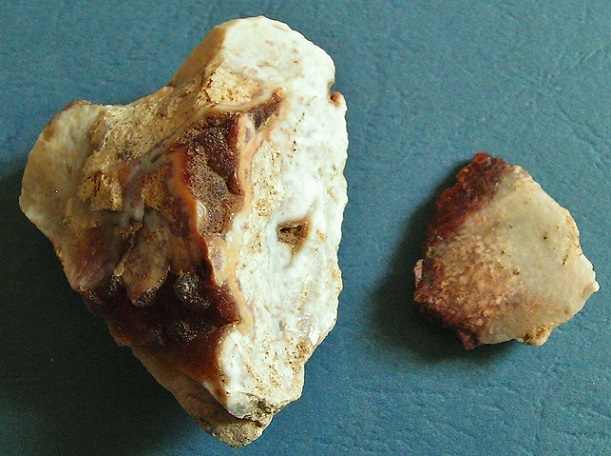 Dans le même genre et provenant du Morbihan, un nucléus et un de ses éclats trouvé à proximité. Dans des zones pauvres en matières premières de qualité, c'est parfois étonnant de voir les variétés de matières que nos lointains ancêtres ont utilisé ou récolté ça et là.