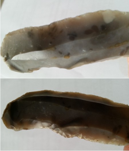 en R1 on voit que l'encoche n'a pas d'arête vive , donc non coupante , ce qui me laisse à penser qu'un lien devait y passer afin de fixer cette lame dans un support en bois , os ou autre ....