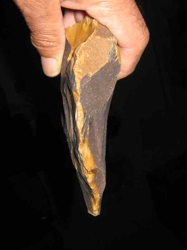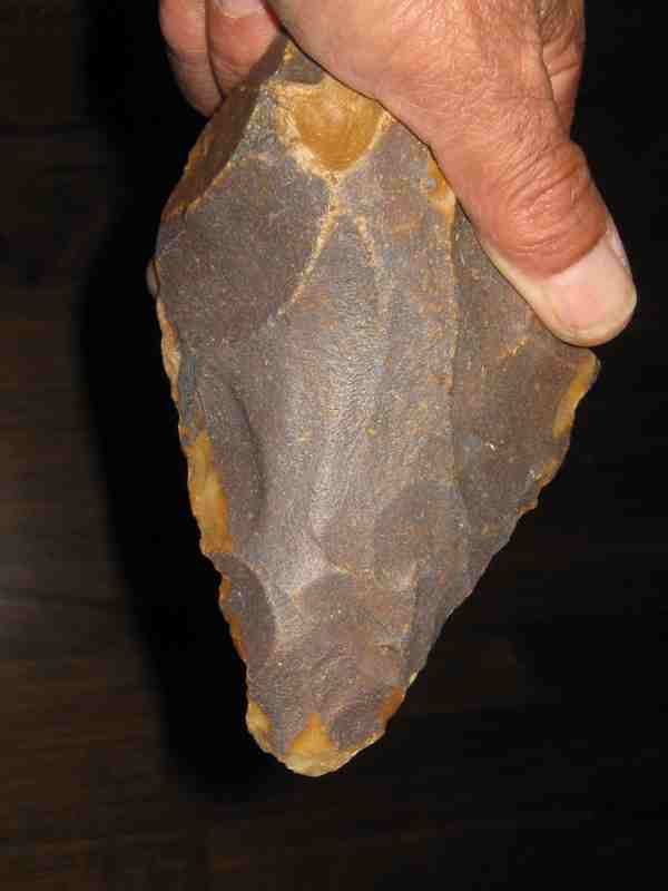 Comme le titre l'indique ,un biface qui a subit les assauts des cruelles machines agricoles ,des impacts qui ont fait sauter la patine ça et la et un morceau du talon est cassé ce qui n'enlève rien a son allure .Il aura passé des millénaires bien au chaud dans sa terre ancestrale et un jour la mécanisation aura eu raison de lui ...dommage ..+colère+