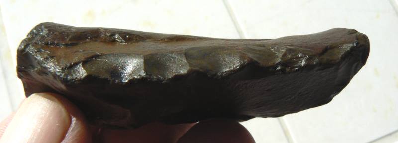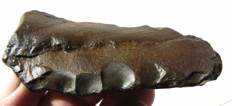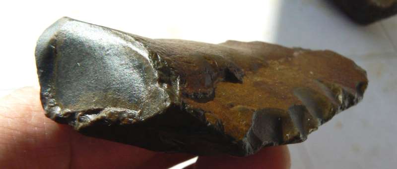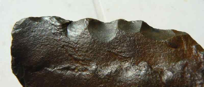 Pourrait-on dire que ce racloir de 8 cms est un denticulé ? J'ai montré quelques pièces du même matériau que cet objet à une géologue, pour elle c'est du jaspe de la famille des calcédoines.