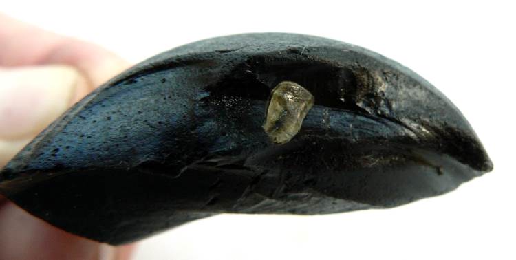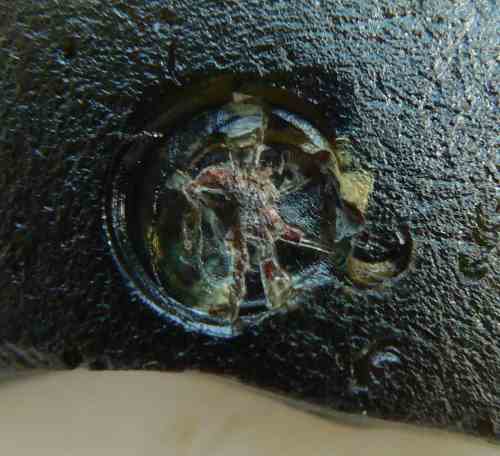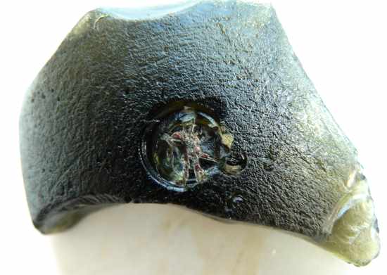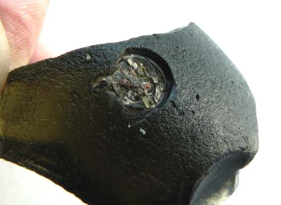 Quand j'ai ramassé ce fragment assez épais provenant certainement d'un culot de bouteille ancienne, j'ai cru voir une sorte d'estampille, le cercle est presque parfait mais à la finale on y voit une inclusion que l'on dirait métallique et sur l'autre côté il y a aussi une inclusion. Je me demande si cet enlèvement parfaitement circulaire est du à l'homme ou une bulle bien ronde c'est formée et a éclatée, laissant apparaitre l'inclusion ? Merci pour vos avis.