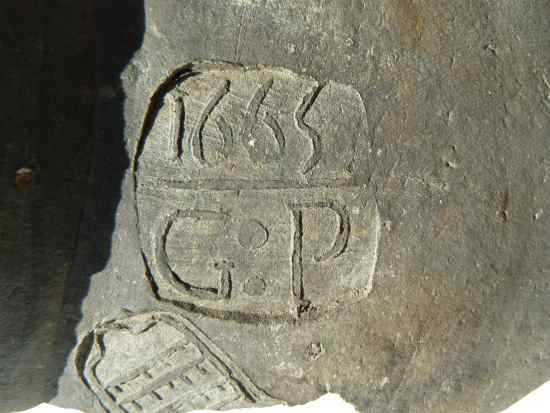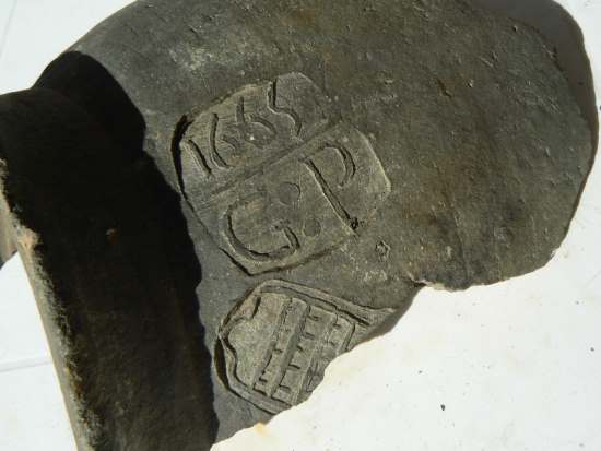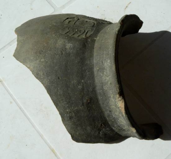 Donc cette poterie daterai de 1665 ! En plus elle serait marquée des initiales du potier. Je n'ai jamais vu de terre cuite enfumée marqué de initiales du potier et datée en plus. Le col me fais penser à un vase tripode..... je ne saurai en dire plus.