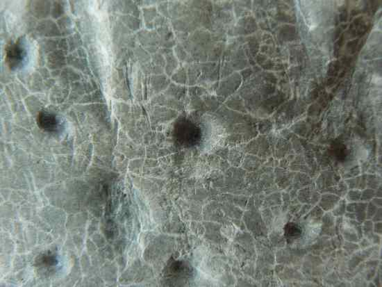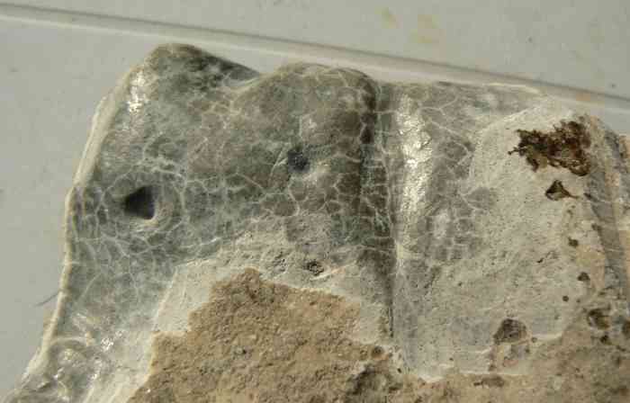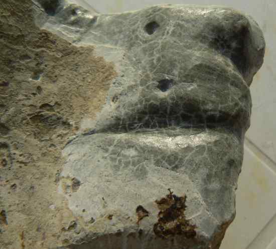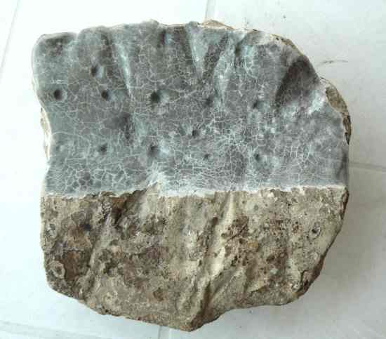 Cet objet réserve bien des surprises. En voulant gratter une cupule avec un scalpel pointu, j'ai voulu continuer de gratter tant que mon scalpel raclait ce que je prenais pour du plâtre mais qui est en fait de la concrétion. J'ai rarement vu une concrétion aussi dense et aussi épaisse sur un cailloux. Ce qui apparait est très lisse et très doux au touché, la couleur est d'un gris moyen avec des petits points noirs. Je vais essayer de dégager une entaille, rien que pour ce petit morceau, j'ai passé plus d'une heure.