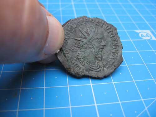 Je pensais tète romaine car bien entendu j'ai cherché autour j'ai un peut creusé avec mon couteau et j'ai trouvé à environ 15 cm cette piéce que je penses romaine.