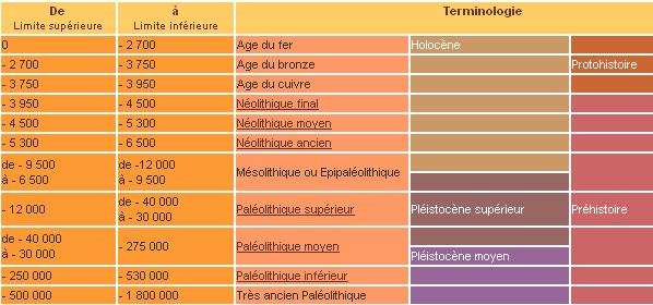 Petit tableau des différentes périodes de la préhistoire d'après Bruno Maureille,