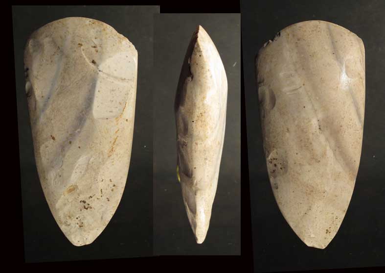 Une hache de 12 cm en silex tertiaire ( peut-être silex de Jabline compte tenu des zones violacées mais sans certitude ).