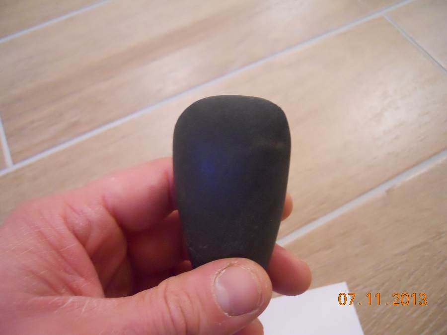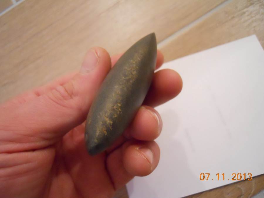 Jolie hache en roche,belle symétrie et tranchant aiguisé, mais je ne me rends pas bien compte de la couleur ni du grain du matériau .